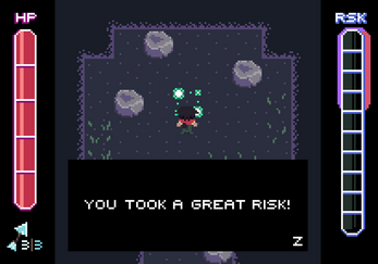 When in Risk Mode you deal more damage, but beware of your RSK bar! Once it's filled too high you'll start losing HP, but it won't kill you. And since the Risk dash makes you immune to damage, particularly skilled players could stay in Risk Mode forever.